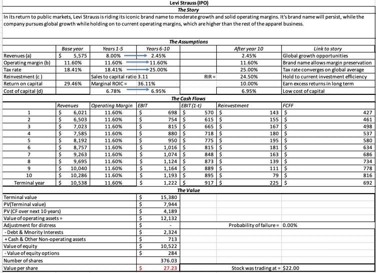 Not all companies that go public are money-losing machines, tech companies in search of a business model. Levi Strauss is a clear counter example. At the time of its public offering, Levi Strauss had already established itself as an American business and cultural icon, with one of thr most recognizable brand names in the world and a working business model. In the trailing 12 months, leading into the IPO, Levi reported a healthy operating margin of close to 10% on revenues of $5.5 billion. The company’s prospectus can be found here:
