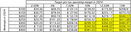 Rather than play scenario games, I chose to vary revenue growth and operating margins to see the combinations that deliver values (shaded in yellow) that exceed the current stock price ($292) in the table below: